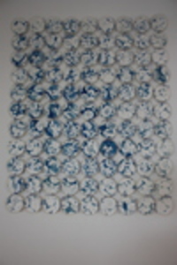 2018Naar aanleiding van mijn gesprekken met B.v.Z. maakte ik dit werk met Papoea's. Van de plastic petrischaaltjes, aan elkaar geknopt. daarin Papier met roest en cyanotype en inkt.